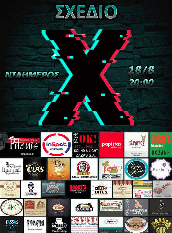 Με μεγάλη μας χαρά σας ανακοινώνουμε το 5ο “Σχέδιο Χ” πάρτι, το οποίο θα πραγματοποιηθεί στης 18/8/2019, στον χώρο που διεξάγεται η εμποροπανήγυρη του Νιάημερου Κοζάνης και ώρα έναρξης 8 μ.μ.