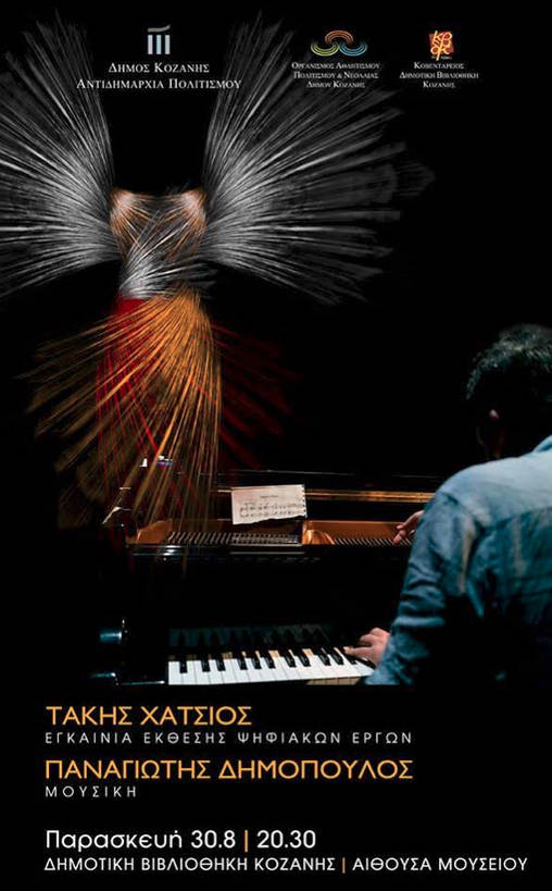 Εγκαινιάζεται την Παρασκευή 30.8.2019 στις 20.30 στη Δημοτική Βιβλιοθήκη Κοζάνης η Έκθεση Ψηφιακών Έργων του Τάκη Χάτσιου (2012-2019). Τα έργα θα προβάλλονται σε οθόνες και θα επενδυθούν με ζωντανή μουσική από τον Παναγιώτη Δημόπουλο στο πιάνο.