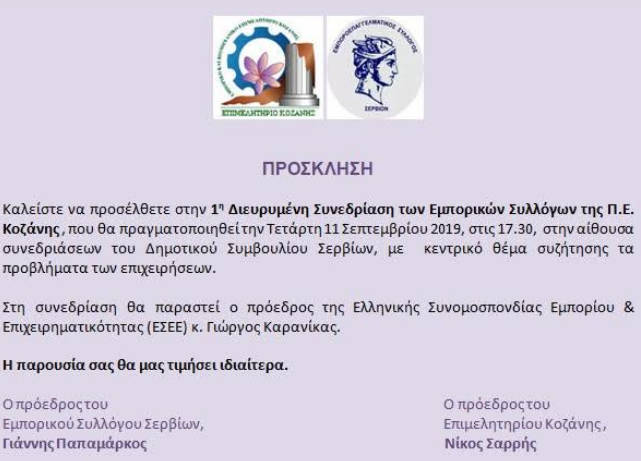 Καλείστε να προσέλθετε στην 1η Διευρυμένη Συνεδρίαση των Εμπορικών Συλλόγων της Π.Ε. Κοζάνης , που θα πραγματοποιηθεί την Τετάρτη 11 Σεπτεμβρίου 2019, στις 17.30, στην αίθουσα συνεδριάσεων του Δημοτικού Συμβουλίου Σερβίων, με κεντρικό θέμα συζήτησης τα προβλήματα των επιχειρήσεων.