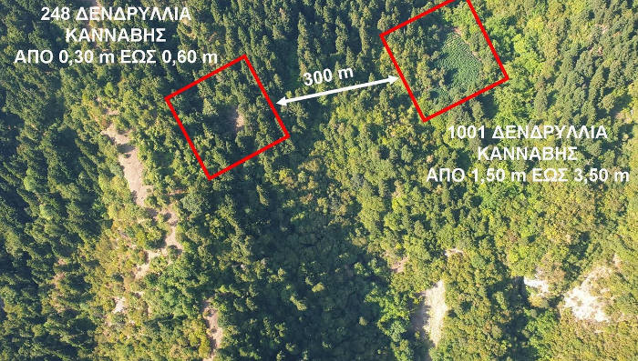 Όσον αφορά στις δυο (2) φυτείες, εκ των οποίων η μία αποτελούμενη από (1.001) δενδρύλλια κάνναβης, ύψους έως 3,5 μέτρα και η άλλη αποτελούμενη από (248) δενδρύλλια κάνναβης, ύψους έως 0,60 εκατοστά, αυτές βρίσκονταν σε κοντινή απόσταση μεταξύ τους (τριακόσια μέτρα), ενώ συνδέονταν μέσω ενός αυτοσχέδιου μονοπατιού, που είχε δημιουργηθεί από μέλη της εγκληματικής ομάδας.