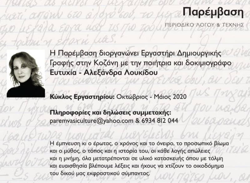 Το λογοτεχνικό περιοδικό «Παρέμβαση» διοργανώνει τον 1ο Κύκλο Εργαστηρίου Δημιουργικής Γραφής και Ανάγνωσης, με την ποιήτρια και δοκιμιογράφο Ευτυχία – Αλεξάνδρα Λουκίδου, που θα διαρκέσει από τον Οκτώβρη του 2019 μέχρι τον Μάιο του 2020.