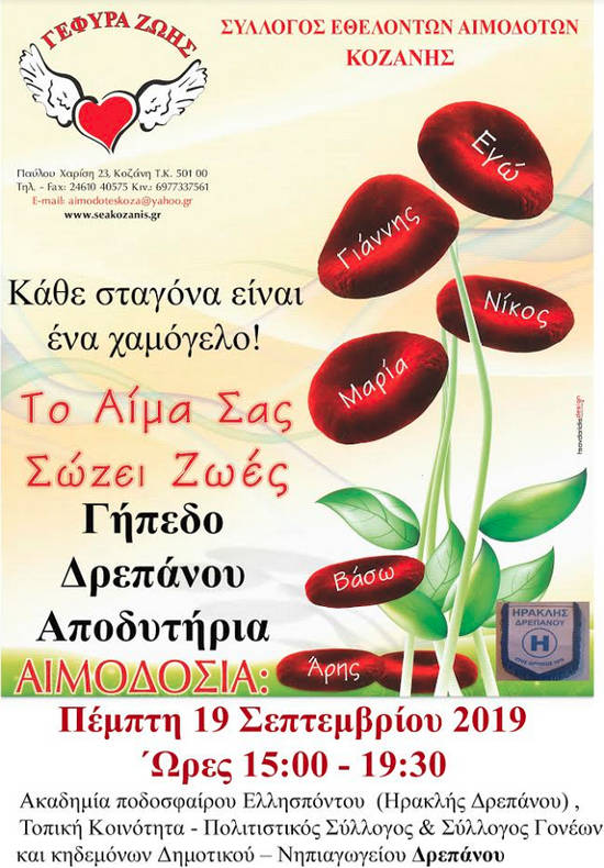 Η Ακαδημία ποδοσφαίρου Ελλησπόντου (Ηρακλής Δρεπάνου), η Τοπική Κοινότητα, ο Πολιτιστικός Σύλλογος & ο Σύλλογος Γονέων και Κηδεμόνων Δημοτικού – Νηπιαγωγείου Δρεπάνου διοργανώνουν Αιμοδοσία την Πέμπτη 19 Σεπτεμβρίου 2019 και ΩΡΑ 15:00-19:30 στο γήπεδο του Δ.Δ. Δρεπάνου(Αποδυτήρια) σε συνεργασία με τον Σ.Ε.Α. Κοζάνης ¨Γέφυρα Ζωής¨ και το τμήμα Αιμοδοσίας του ¨Μαμάτσειου¨ Γενικού Νοσοκομείου Κοζάνης.