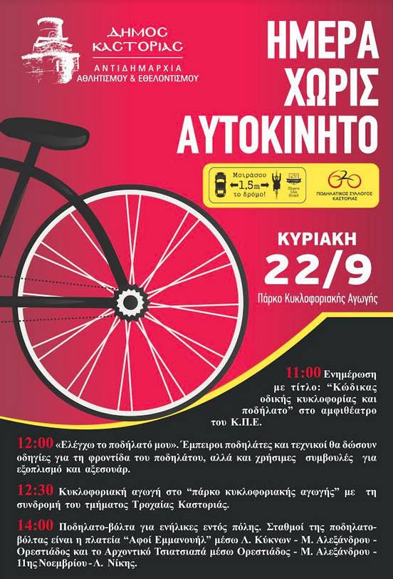 Σημειώνεται ότι ο Δήμος Καστοριάς θα διαθέσει ποδήλατα και όλον τον απαραίτητο εξοπλισμό σε παιδιά ηλικίας Δημοτικού, προκειμένου να συμμετέχουν με ασφάλεια στις προαναφερόμενες δράσεις.