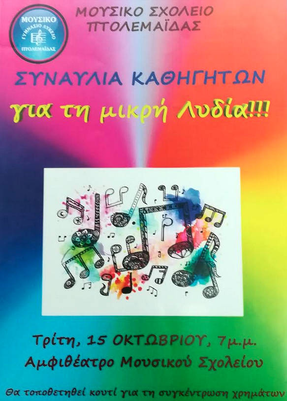 Πτολεμαΐδα 14/10/2019 Η πιο γλυκιά μελωδία για τη μικρή Λυδία στην Πτολεμαΐδα! 0 Η πιο γλυκιά μελωδία για τη μικρή Λυδία! Το πρόγραμμα της συναυλίας των καθηγητών μουσικής του σχολείου θα είναι υπέροχο, αλλά ακόμη πιο υπέροχος ο σκοπός αυτής της συναυλίας αγάπης! Σας περιμένουμε όλες και όλους!