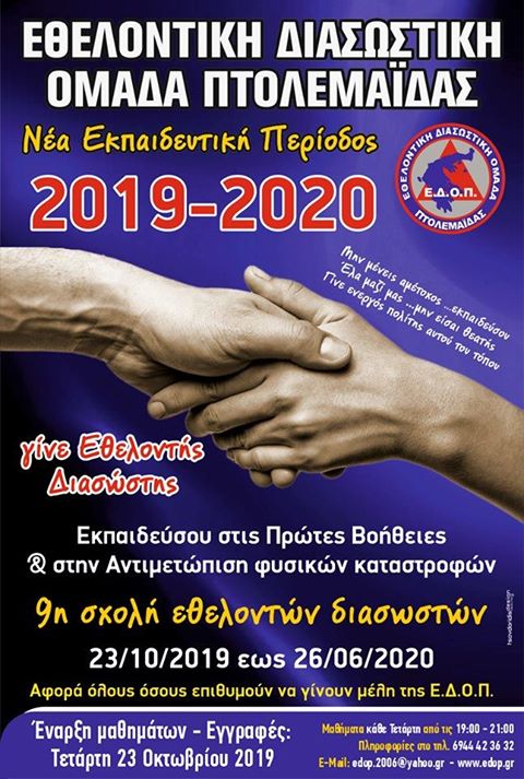 Στις 23 Οκτωβρίου 2019, ξεκινάει η νέα εκπαιδευτική περίοδος, για όσους επιθυμούν να ενταχθούνε και να γίνουν μέλη της Εθελοντικής Διασωστικής Ομάδας Πτολεμαΐδας.