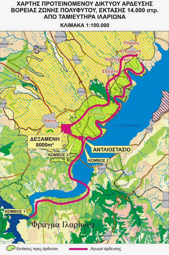 Η συνολική διάταξη και το εκτιμώμενο μέγεθος των έργων υποδομής για μεταφορά του νερού στις συγκεκριμένες περιοχές από το φράγμα Ιλαρίωνα, άντλησής του, όπου απαιτείται, καθώς και διανομής του στα αγροκτήματα, παρουσιάζεται στο συνημμένο σκαρίφημα.