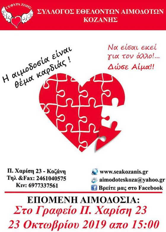 Αιμοδοσία την Τετάρτη 23 Οκτωβρίου 2019 από τις 15:00 – 20:00, (προσέλευση μέχρι 19:30), στα γραφεία του Συλλόγου, Π. Χαρίση 23.
