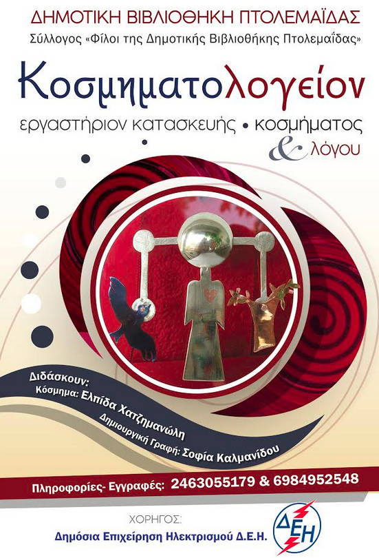 Το «Κοσμηματολογείον», είναι ένα υποστηρικτικό εργαστήριο κατασκευής κοσμήματος και λόγου, το οποίο θα λειτουργήσει για μία ακόμη χρονιά στη Δημοτική Βιβλιοθήκη Πτολεμαΐδας και θα κοσμήσει το ετήσιο πρόγραμμα φιλαναγνωσίας, με τίτλο: «Χαριστική Βιβλιοθήκη Πτολεμαΐδας».