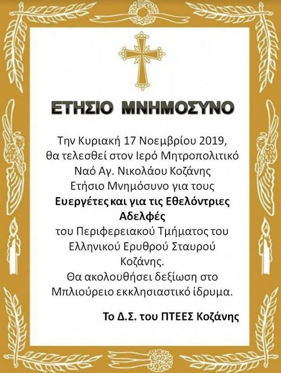 Την Κυριακή 17 Νοεμβρίου 2019 θα τελεστεί στον Ιερό Μητροπολιτικό Ναό Αγ. Νικολάου Κοζάνης Ετήσιο Μνημόσυνο για τους Ευεργέτες και τις Εθελόντριες Αδελφές του Περιφερειακού Τμήματος του Ελληνικού Ερυθρού Σταυρού Κοζάνης. Θα ακολουθήσει δεξίωση στο Μπλιούρειο εκκλησιαστικό ίδρυμα.