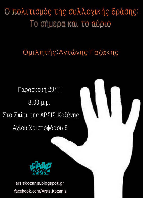 Την Παρασκευή, 29 Νοεμβρίου, στις 8.00 το βράδυ σας καλούμε στο Σπίτι της ΑΡΣΙΣ Κοζάνης, στην ανοιχτή συζήτηση: «ο πολιτισμός της συλλογικής δράσης- το σήμερα και το αύριο», με καλεσμένο τον Αντώνη Γαζάκη.