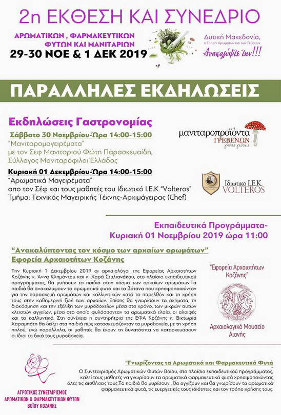 Η Εφορεία Αρχαιοτήτων Κοζάνης συμμετέχει στην «2η Έκθεση και Συνέδριο Αρωματικών, Φαρμακευτικών Φυτών και Μανιταριών», που διοργανώνει η Περιφέρεια Δυτικής Μακεδονίας, με παράλληλη εκδήλωση που θα πραγματοποιηθεί την Κυριακή 1 Νοεμβρίου 2019, στις 11:00 η ώρα, στο Εκθεσιακό Κέντρο Κοίλων Κοζάνης.