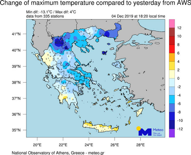 Στους 13 βαθμούς Κελσίου έφτασε η πτώση της μέγιστης θερμοκρασίας την Τετάρτη 4/12 σε σχέση με την Τρίτη 3/12. Όπως φαίνεται χαρακτηριστικά στον χάρτη που ακολουθεί, η μεγαλύτερη πτώση στη μέγιστη θερμοκρασία καταγράφηκε στη Δυτική Μακεδονία, στη Θράκη και στη Λήμνο. Αντίθετα, σε αρκετές περιοχές της δυτικής χώρας, στο Νότιο Αιγαίο και στην Κρήτη καταγράφηκε μικρή άνοδος της μέγιστης θερμοκρασίας. Τα δεδομένα προέρχονται από το δίκτυο αυτόματων μετεωρολογικών σταθμών του Εθνικού Αστεροσκοπείου Αθηνών/meteo.gr.