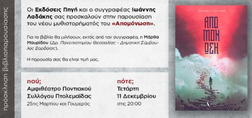 Οι Εκδόσεις Πηγή και ο συγγραφέας Ιωάννης Λαδάκης σας προσκαλούν στην παρουσίαση του νέου μυθιστορήματός του “Απομόνωση”.