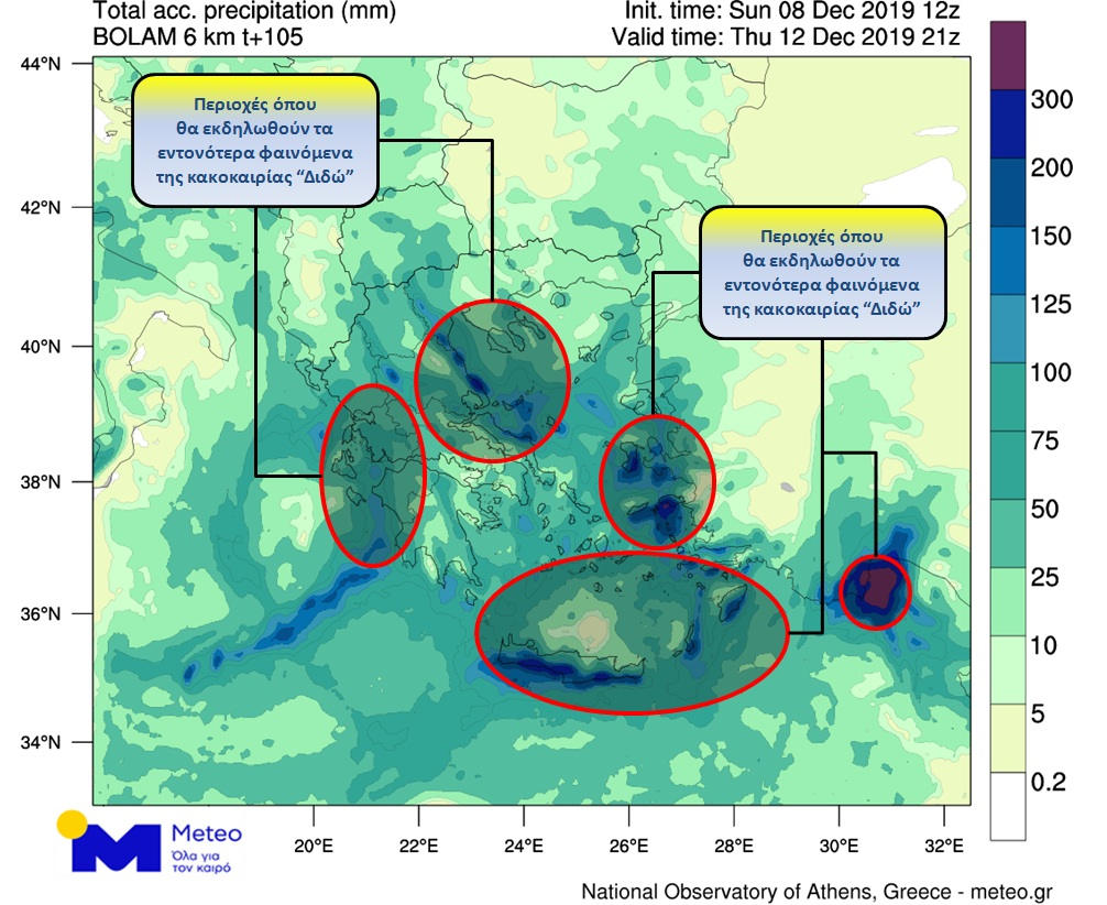 Στον προγνωστικό χάρτη που ακολουθεί παρουσιάζονται οι αθροιστικές ποσότητες υετού (βροχές / καταιγίδες / χιονοπτώσεις) της “Διδούς”, έως τις βραδινές ώρες της Πέμπτης 12/12.