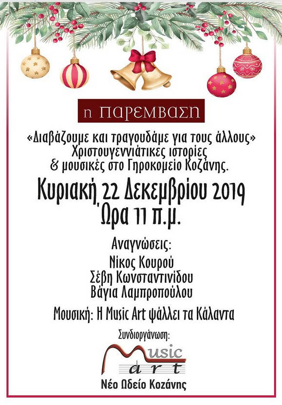 Η «Παρέμβαση», σε συνεργασία με την «Music Art», στο πλαίσιο της εθελοντικής δράσης «Διαβάζουμε και τραγουδάμε για τους άλλους», πραγματοποιεί Χριστουγεννιάτικη γιορτή στο Γηροκομείο Κοζάνης, όπου ηθοποιοί θα διαβάσουν χριστουγεννιάτικες ιστορίες στους ηλικιωμένους, δίνοντάς τους έτσι την ευκαιρία να απολαύσουν την αναγνωστική διαδικασία και να έχουν πρόσβαση στον μαγευτικό κόσμο του βιβλίου.