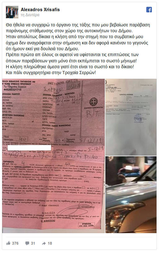 «Θα ήθελα να συγχαρώ το όργανο της τάξης που μου βεβαίωσε παράβαση παράνομης στάθμευσης στον χώρο της αυτοκινήτων του Δήμου.