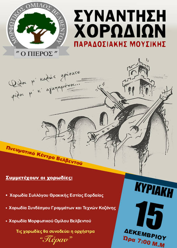 Ο Μορφωτικός Όμιλος Βελβεντού διοργανώνει Συνάντηση Χορωδιών Παραδοσιακού Τραγουδιού, την Κυριακή 15 Δεκεμβρίου, ώρα 19.00, στο Πνευματικό Κέντρο Βελβεντού.