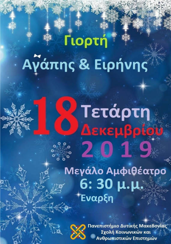 Γιορτή Αγάπης και Ειρήνης διοργανώνει η Σχολή Κοινωνικών και Ανθρωπιστικών Επιστημών την Τετάρτη 18 Δεκεμβρίου 2019, και ώρα 18:30 μ.μ., στο Μεγάλο Αμφιθέατρο των εγκαταστάσεων του Πανεπιστημίου στη Φλώρινα.