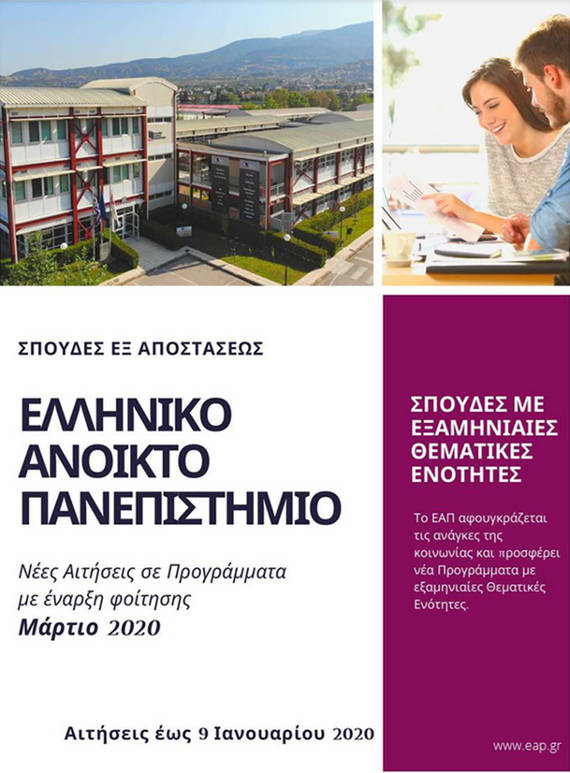 Το Ελληνικό Ανοικτό Πανεπιστήμιο, σύμφωνα με την απόφαση της υπ’ αριθ. 54040/28.11.2019 Συνεδρίασης της Διοικούσας Επιτροπής του Ε.Α.Π, προσφέρει 2 Προπτυχιακά και 13 Μεταπτυχιακά Προγράμματα Σπουδών με εξαμηνιαία διάρθρωση και έναρξη σπουδών το Εαρινό Εξάμηνο του Ακαδημαϊκού Έτους 2019-2020.