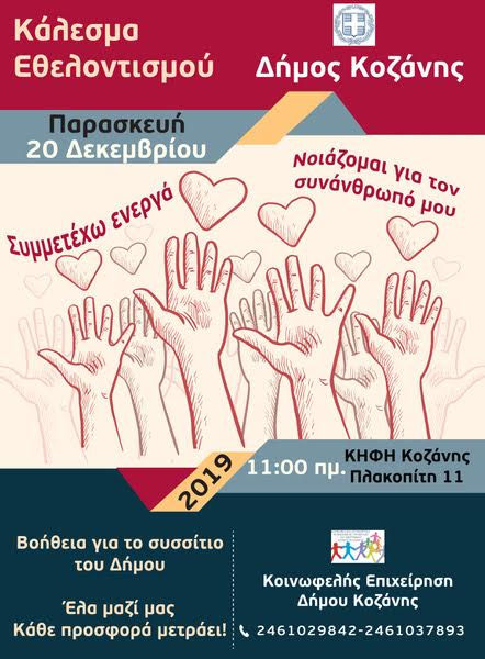 Η Κοινωφελής Επιχείρηση Κοινωνικής Πρόνοιας και Μέριμνας του Δήμου Κοζάνης διοργανώνει, ενόψει των Χριστουγέννων, τιμητική εκδήλωση για την συμμετοχή και προσφορά των εθελοντών στο συσσίτιο, την Παρασκευή 20 Δεκεμβρίου 2019 και ώρα 11 π.μ., στο χώρο του συσσιτίου (Πλακοπίτη 11, απέναντι από τον Ο.Α.Ε.Δ.).