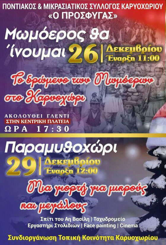 Ο Πρόεδρος και τα μέλη του Διοικητικού Συμβουλίου του ΠΟΝΤΙΑΚΟΥ & ΜΙΚΡΑΣΙΑΤΙΚΟΥ ΣΥΛΛΟΓΟΥ ΚΑΡΥΟΧΩΡΙΟΥ «Ο ΠΡΟΣΦΥΓΑΣ» συνδιοργανώνει εορταστικές εκδηλώσεις και σας προσκαλεί στις 26 & 29 Δεκεμβρίου και στις 4 Ιανουαρίου, σύμφωνα με το ακόλουθο πρόγραμμα: