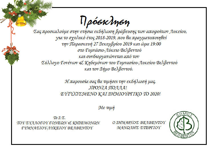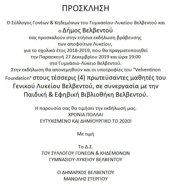 Ο Σύλλογος Γονέων & Κηδεμόνων του Γυμνασίου-Λυκείου Βελβεντού και ο Δήμος Βελβεντού σας προσκαλούν στην ετήσια εκδήλωση βράβευσης των αποφοίτων Λυκείου, για το σχολικό έτος 2018-2019, που θα πραγματοποιηθεί την Παρασκευή 27 Δεκεμβρίου 2019 και ώρα 19:00 στο Γυμνάσιο-Λύκειο Βελβεντού.