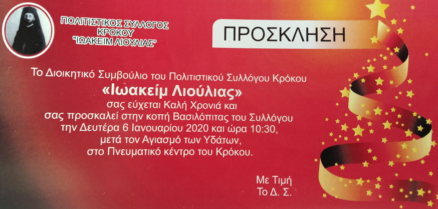 Κοζάνη 03/01/2020 Πρόσκληση στην κοπή πίτας του Πολιτιστικού Συλλόγου Κρόκου “Ιωακείμ Λιούλιας” 1 Πρόσκληση στην κοπή πίτας του Πολιτιστικού Συλλόγου Κρόκου “Ιωακείμ Λιούλιας”
