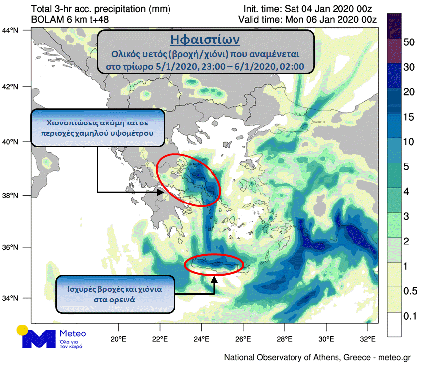 Στον παραπάνω χάρτη φαίνεται ο ολικός υετός (βροχή / χιόνι) που αναμένεται κατά το τρίωρο 5/1/2020, 23:00 – 6/1/2020, 02:00, ενώ σημειώνονται και οι περιοχές των κυριοτέρων φαινόμενων.