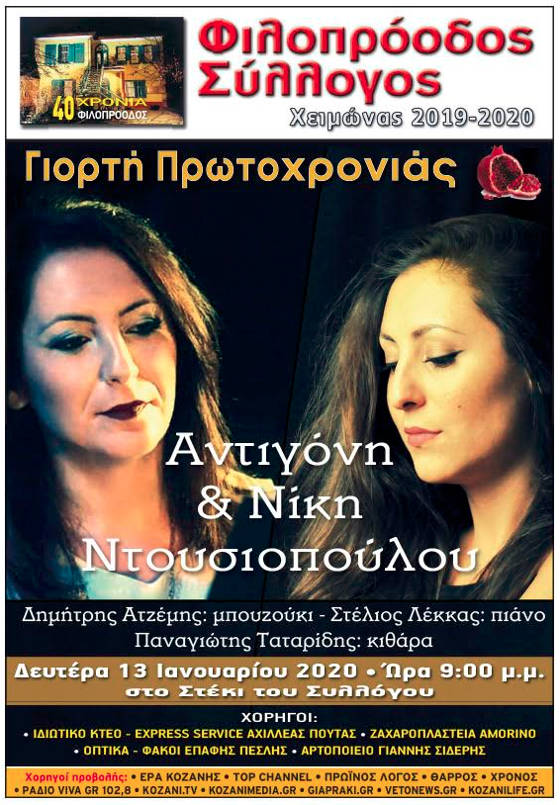 Ο Φιλοπρόοδος Σύλλογος απευθύνει γιορτινό κάλεσμα στα μέλη και τους φίλους του, για το καλωσόρισμα της νέας χρονιάς με μουσική εκδήλωση, όπου τις καθιερωμένες ευχές και την κοπή της βασιλόπιτας θα διαδεχθεί η πολύ ενδιαφέρουσα, και με κοζανίτικο άρωμα, εμφάνιση των αδελφών Αντιγόνης και Νίκης Ντουσιοπούλου.