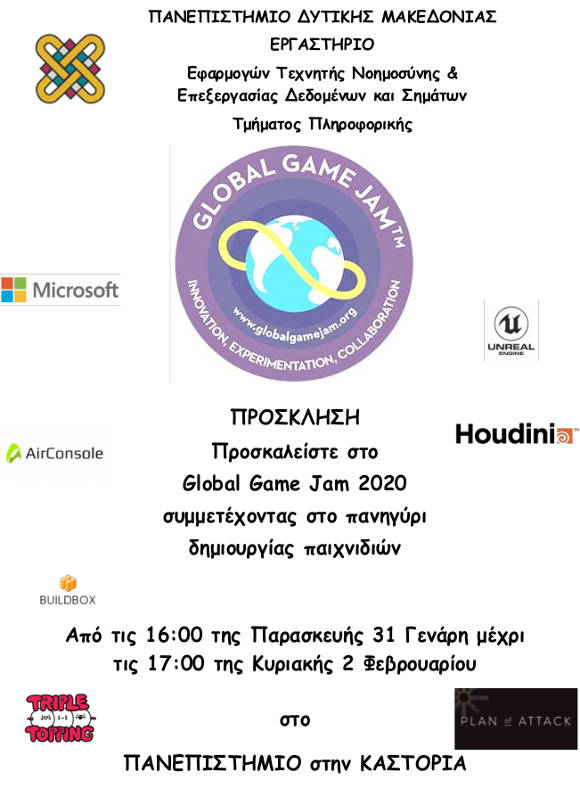 Έπειτα από τις προηγούμενες επιτυχημένες συμμετοχές στο Global Game Jam, το εργαστήριο “Εφαρμογών Τεχνητής Νοημοσύνης & Επεξεργασίας Δεδομένων και Σημάτων” του Τμήματος Πληροφορικής, του Πανεπιστημίου Δυτικής Μακεδονίας, αποφάσισε να αποτελέσει και φέτος μία από τις εκατοντάδες φυσικές τοποθεσίες του Global Game Jam 2020.