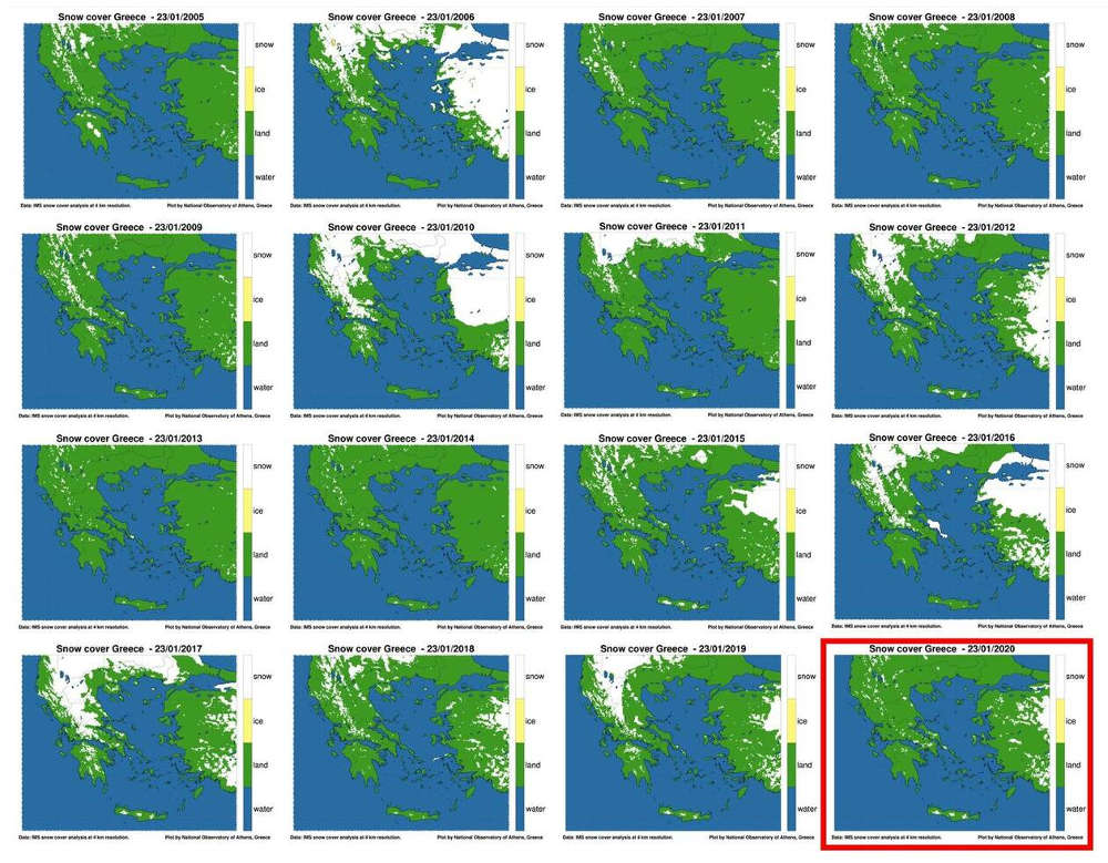 Μόνο το 3% της έκτασης της Ελλάδας καλύπτεται από χιόνι αυτή την εποχή, σύμφωνα με τις εικόνες των δορυφόρων. Η χιονοκάλυψη στη χώρα μας τον Ιανουάριο κινείται σε πολύ χαμηλά, αλλά όχι πρωτόγνωρα, επίπεδα. Το 2020 είναι ένα από τα έτη με την μικρότερη χιονοκάλυψη της περιόδου 2005-2020, σύμφωνα με το meteo του Εθνικού Αστεροσκοπείου Αθηνών.