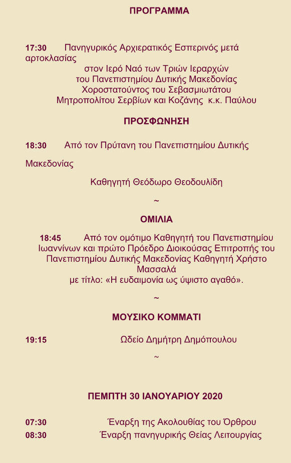 Σας προσκαλούμε να τιμήσετε με την παρουσία σας τον Εορτασμό των Τριών Ιεραρχών και της Ημέρας των Γραμμάτων που θα πραγματοποιηθεί την Τετάρτη 29 Ιανουαρίου 2020 και ώρα 18:30 στο αμφιθέατρο Σπύρος Αρσένης (Πανεπιστημιούπολη, Κοίλα Κοζάνης)