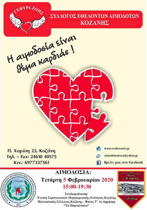 Η Ένωση Στρατιωτικών Περιφερειακής Ενότητας Κοζάνης και ο Πολιτιστικός Σύλλογος Κοζάνης – Φανός τα’ Αι Δημήτρη «Τα Παρταλόπλα» συμμετέχουν στην 3η Αιμοδοσία της ¨Γέφυρας Ζωής¨ στα γραφεία του Συλλόγου, Π. Χαρίση 23, την Τετάρτη 5 Φεβρουαρίου 2020 από 15:00 – 20:00, (προσέλευση μέχρι 19:30 -Τρώμε ελαφρύ γεύμα 3ώρες πριν).