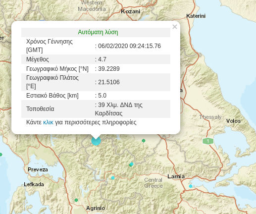 Δυτική Μακεδονία 06/02/2020 Σεισμική δόνηση 4,7 ρίχτερ στην Καρδίτσα – Αισθητός στη Δυτική Μακεδονία 0 Σεισμική δόνηση μεγέθους 4,7 ρίχτερ σημειώθηκε στις 11:24 της Πέμπτης 6 Φεβρουαρίου 39 χλμ. νοτιοδυτικά της Καρδίτσας με εστιακό βάθος 5 χλμ. Ο σεισμός έγινε αισθητός και σε αρκετές περιοχές της Δυτικής Μακεδονίας. Α.Ν. για το KOZANILIFE.GR