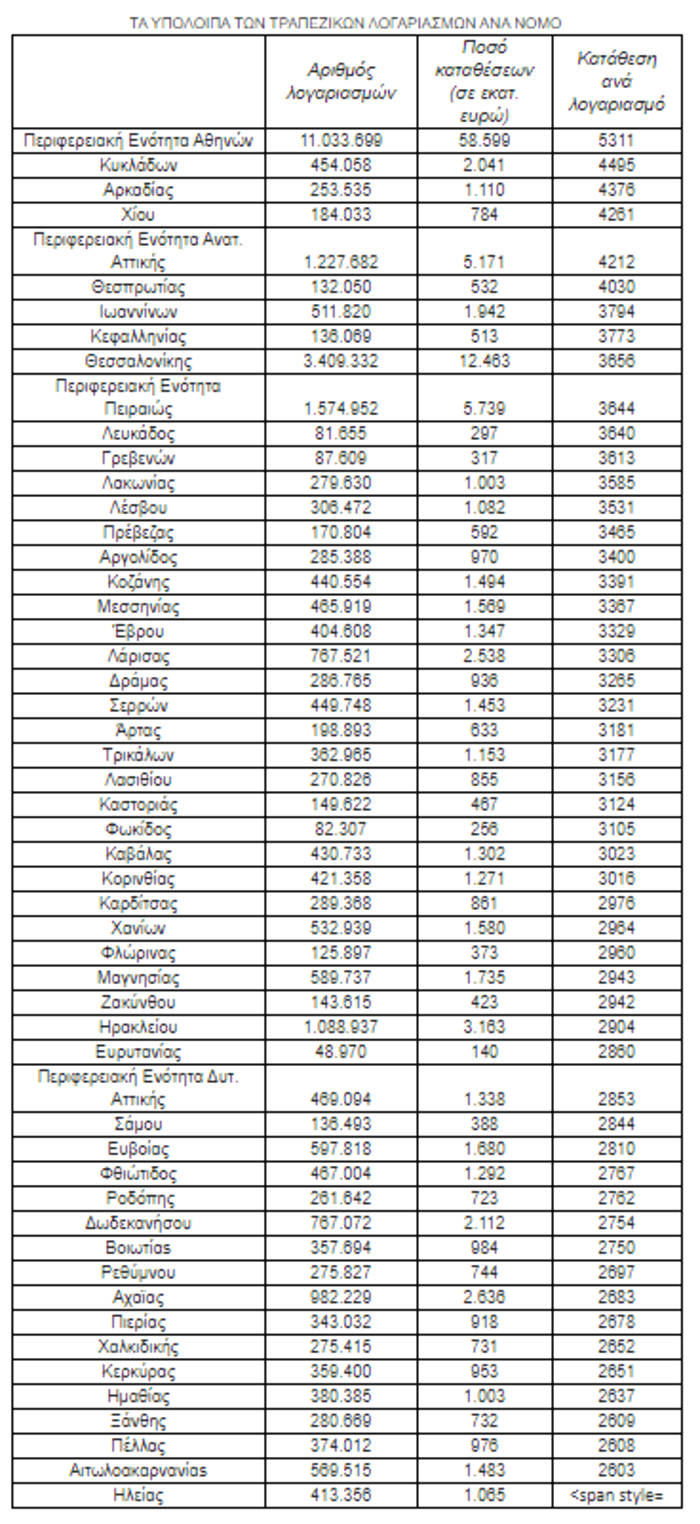 Υπάρχουν βέβαια και οι νομοί με μέση κατάθεση σαφώς μικρότερη σε σχέση με τον μέσο όρο της χώρας. Ο αναλυτικός πίνακας που δημοσιεύεται αναδεικνύει ως μικρότερους καταθέτες τους κατοίκους του Κιλκίς, της Ηλείας, της Ημαθίας κλπ. Σε όλες αυτές τις περιοχές, η μέση κατάθεση πέφτει κάτω από το όριο των 2600 ευρώ ανά τραπεζικό λογαριασμό.