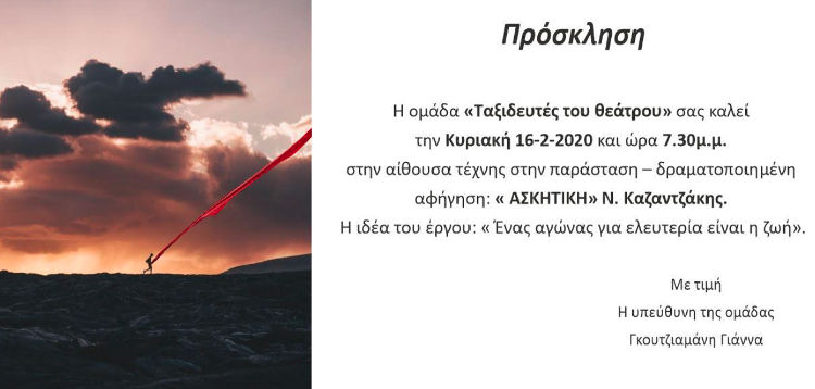 Οι Ταξιδευτές του θεάτρου ( 18 παιδιά από 11 σχολεία) τόλμησαν να πιουν από το κρασί της Ασκητικής του Ν. Καζαντζάκη. Επί 5 μήνες ασκήθηκαν, ακούοντας τη φωνή του θεού, « να έχουν ανοιχτά τα μάτια τους για να βλέπει» και «στύλωσαν τα αυτιά τους για να ακούει». Μαζί του είδαν και άκουσαν τι κρύβεται πίσω από τα φαινόμενα, αυτό που ζει το άτομο και η κοινωνία σήμερα: