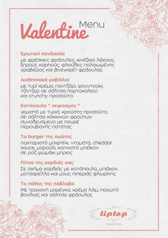 Με ένα ιδιαίτερο μενού το κατάστημα Tip Top Restaurant υποδέχεται την ημέρα των ερωτευμένων την Παρασκευή 14 Φεβρουαρίου… Με αγνά και φρέσκα υλικά, οι Chef της Tip Top θα σας προσφέρουν μία μοναδική γαστρονομική εμπειρία με την εκπληκτική θέα που προσφέρει η Tip Top στο κέντρο της Κοζάνης…