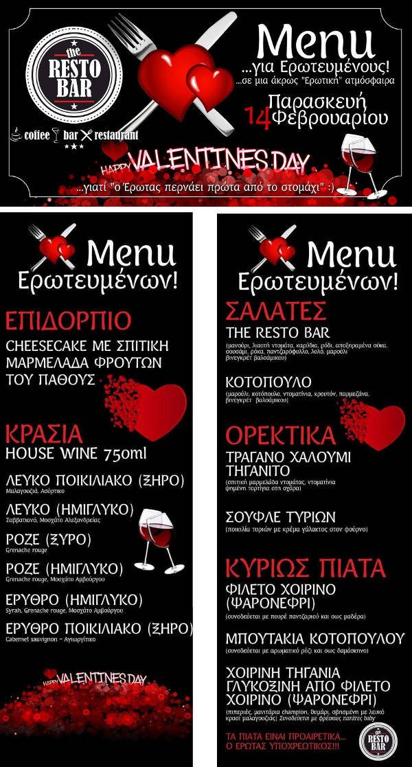 Παρασκευή 14 Φεβρουαρίου 2020, ημέρα των ερωτευμένων. Αρκετές προτάσεις για τη διασκέδασή σας από επιλεγμένα καταστήματα της Κοζάνης, με ιδιαίτερα events, εορταστικά μενού και πολλές εκπλήξεις!