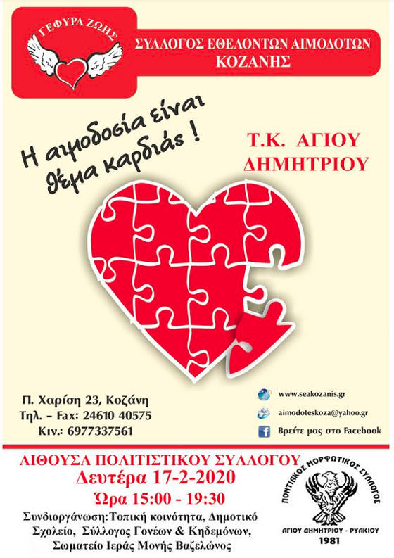 Την Δευτέρα 17 Φεβρουαρίου 2020 και ΩΡΑ 15:00-20:00 (προσέλευση ως 19:30) στην Αίθουσα του Συλλόγου Αγίου Δημητρίου -Ρυακίου διοργανώνεται Αιμοδοσία του Σ.Ε.Α. Κοζάνης, σε συνεργασία με τον Ποντιακό Μορφωτικό Σύλλογο Αγίου Δημητρίου – Ρυακίου, το Δημοτικό Σχολείο, τον Σύλλογο Γονέων και Κηδεμόνων και το Σωματείο Ιεράς Μονής Βαζελώνος με το τμήμα Αιμοδοσίας του Μαμάτσειου Γενικού Νοσοκομείου Κοζάνης.