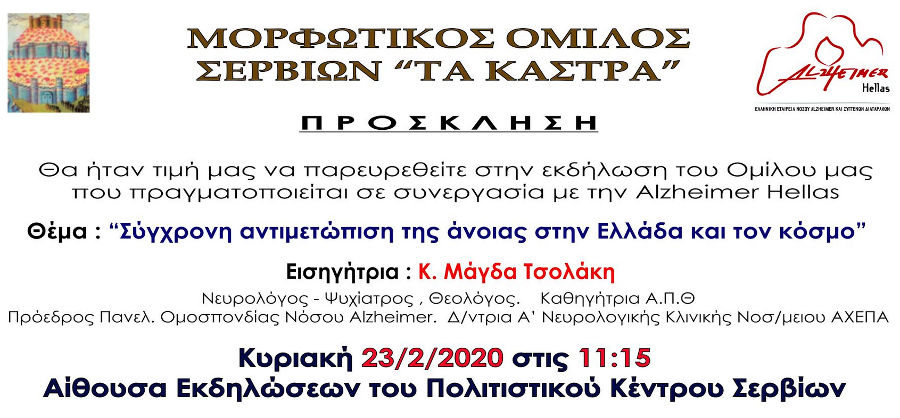 Σέρβια - Βελβεντό 17/02/2020 Εκδήλωση στα Σέρβια για την αντιμετώπιση της άνοιας στην Ελλάδα και τον κόσμο 0 Εκδήλωση στα Σέρβια για την αντιμετώπιση της άνοιας στην Ελλάδα και τον κόσμο