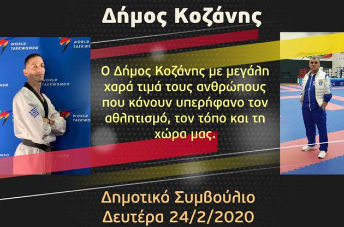 Στο πλαίσιο της συνεδρίασης του Δημοτικού Συμβουλίου Κοζάνης τη Δευτέρα 24 Φεβρουαρίου 2020, στις 6 το απόγευμα, θα απονεμηθεί τιμητική διάκριση στον Παγκόσμιο Πρωταθλητή, Τεληκωστόγλου Απόστολο, καθώς και στον Ομοσπονδιακό Προπονητή της Εθνικής Ομάδας Ταεκβοντό, Αλμασίδη Χρήστο, σύμφωνα με την αριθμ. 2/2020 ομόφωνη Απόφαση του Δημοτικού Συμβουλίου Κοζάνης.