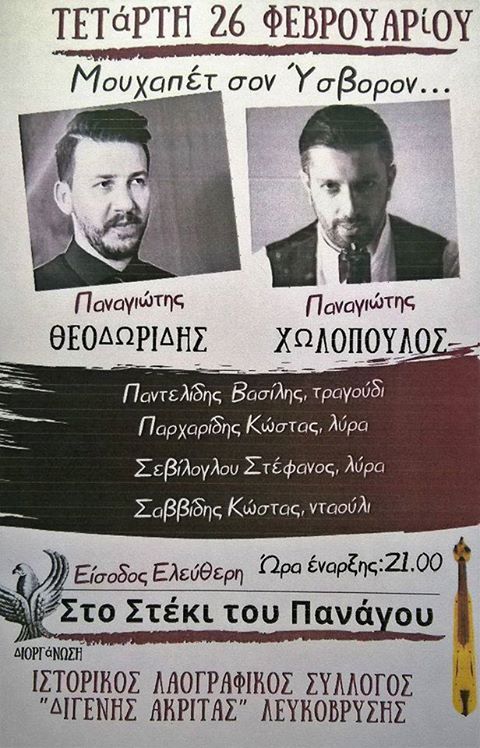 Ο Ιστορικός Λαογραφικός Σύλλογος Λευκόβρυσης Κοζάνης «Διγενής Ακρίτας» σας προσκαλεί στο Μουχαπέτ που θα πραγματοποιηθεί την Τετάρτη 27 Φεβορυαρίου 2020 και ώρα 21.00 στο Στέκι του ΠΑΝΑΓΟΥ.