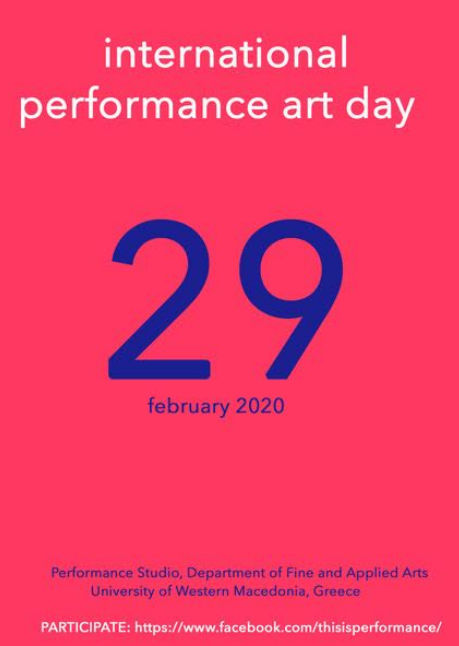 Το Εργαστήριο Performance Art του Τμήματος Εικαστικών και Εφαρμοσμένων Τεχνών της Σχολής Καλών Τεχνών του Πανεπιστημίου Δυτικής Μακεδονίας συμμετέχει στην εναρκτήρια εκδήλωση του εορτασμού της Διεθνούς Ημέρας Performance Art με την εικοσιτετράωρη δράση «Ένα λεπτό και λιγότερο» (One Minute and Under). Performer απ’ όλο τον κόσμο μας λένε τί είναι γι’ αυτούς performance και γιατί την επιλέγουν ως καλλιτεχνική έκφραση. Όλα τα βίντεο «ποστάρονται» ζωντανά κατά τη διάρκεια των 24 ωρών της 29ης Φεβρουαρίου από το λογαριασμό των performer (f/b) και κοινοποιούνται στη σελίδα του event από τους ίδιους ή τους διοργανωτές. Επιλογή από τα βίντεο θ’ αναρτηθούν στη σελίδα του Performance studio https://www.facebook.com/thisisperformance/).