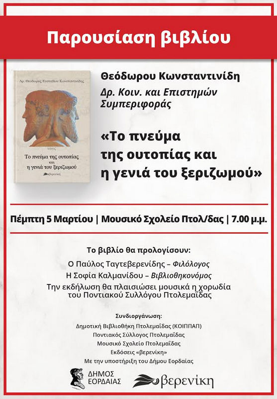 Η Δημοτική Βιβλιοθήκη Πτολεμαΐδας, ο Ποντιακός Σύλλογος Πτολεμαΐδας, το Μουσικό Σχολείο Πτολεμαΐδας και οι εκδόσεις «βερενίκη», με την υποστήριξη του Δήμου Εορδαίας, υποδέχονται τον συγγραφέα Δρ.Θεόδωρο Ε. Κωνσταντινίδη και παρουσιάζουν το νέο του πόνημα, «Το πνεύμα της ουτοπίας και η γενιά του ξεριζωμού», που κυκλοφορεί από τις εκδόσεις «βερενίκη».