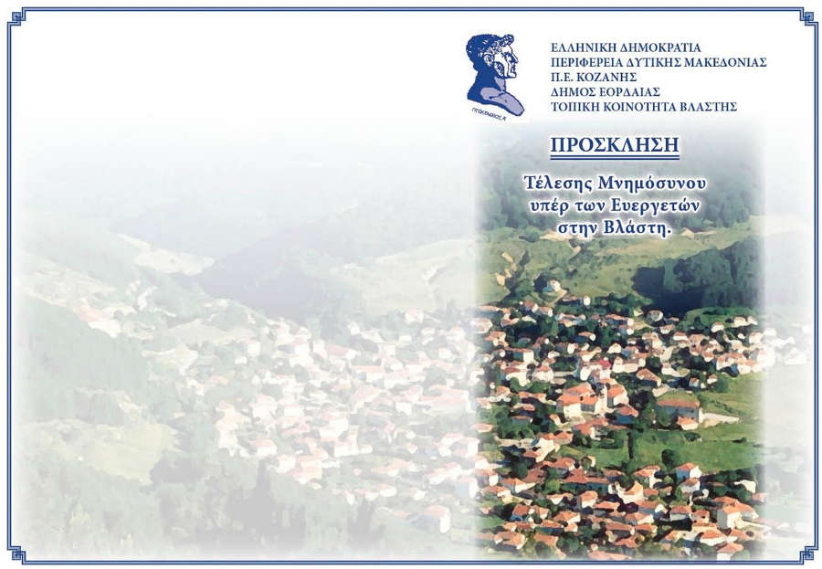 Ο Δήμαρχος Εορδαίας Παναγιώτης Πλακεντάς και ο Πρόεδρος της Κοινότητας Βλάστης Ιωάννης Τζιούμαρης, σας προσκαλούν την Κυριακή της «ΟΡΘΟΔΟΞΙΑΣ» 08 Μαρτίου 2020, ώρα 09:00, στον Ιερό Ναό Αγίου Μάρκου Βλάστης, στην Τέλεση Μνημόσυνου υπέρ των Ευεργετών Βλάστης.