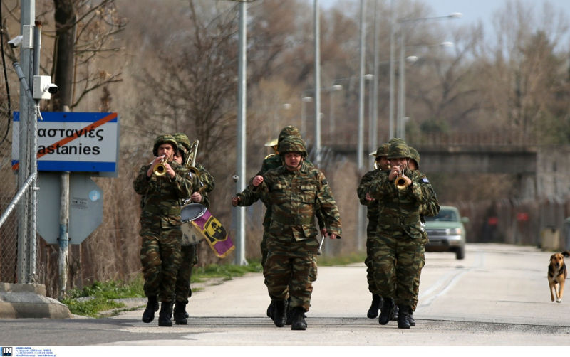 Μια χαρακτηριστική στιγμή από τις Καστανιές του Έβρου με την ανάκρουση του εθνικού ύμνου και το παιάνισμα του «Μακεδονία Ξακουστή» από τη μπάντα του στρατού κατέγραψε ο τηλεοπτικός φακός.