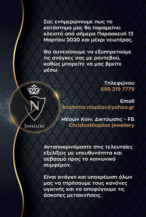 Προτάσεις 14/03/2020 Πως μπορείτε να εξυπηρετηθείτε από το κατάστημα Christos Nioplias Jewellery 0 Πως μπορείτε να εξυπηρετηθείτε από το κατάστημα Christos Nioplias Jewellery:
