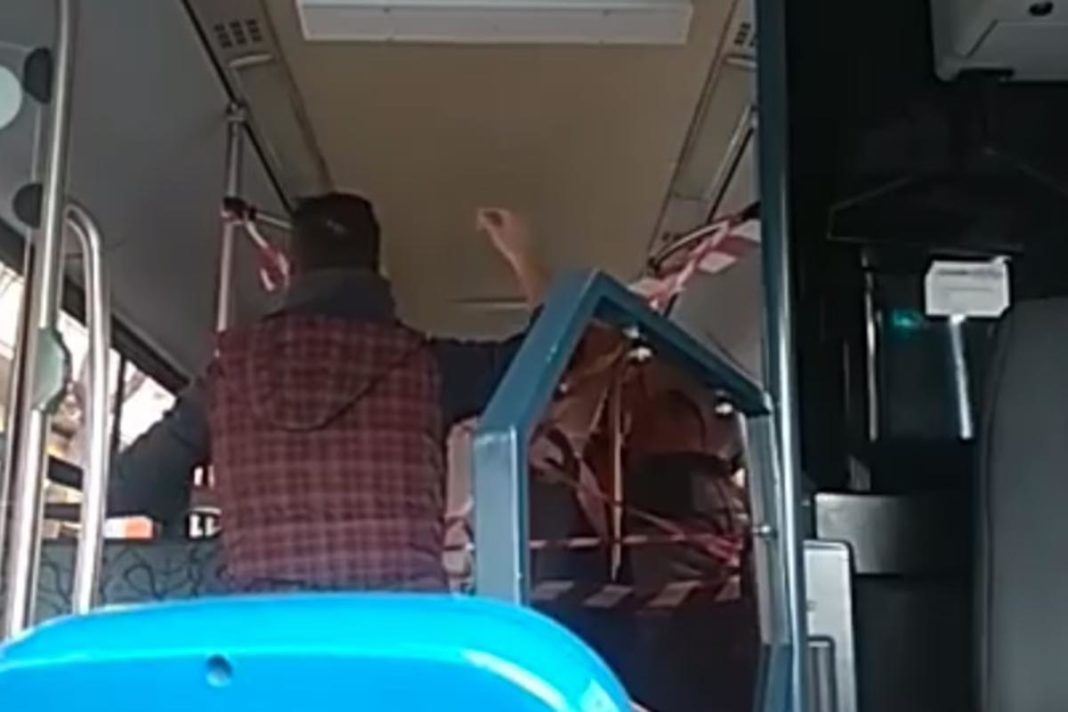 Στο βίντεο ο οδηγός έχει σταματήσει το λεωφορείο του, κατέβηκε από την θέση του και απευθύνεται σε όσους έχουν δημιουργήσει συνωστισμό μέσα στο όχημα: