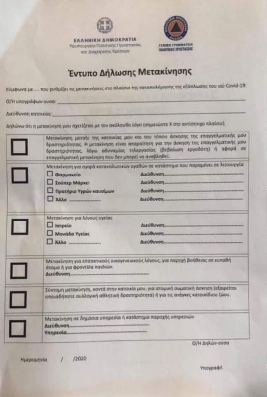 Αυτό θα είναι το έντυπο δήλωσης μετακίνησης σε περίπτωση καθολικής απαγόρευσης κυκλοφορίας