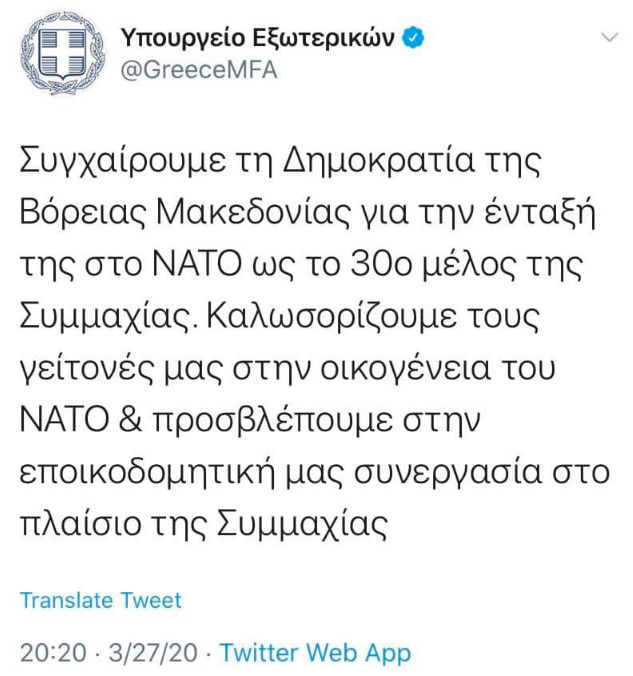 Όπως πιστεύει, το ζήτημα της επίλυσης του ονοματολογικού είχε ως μόνο σκοπό την ένταξη στο ΝΑΤΟ.